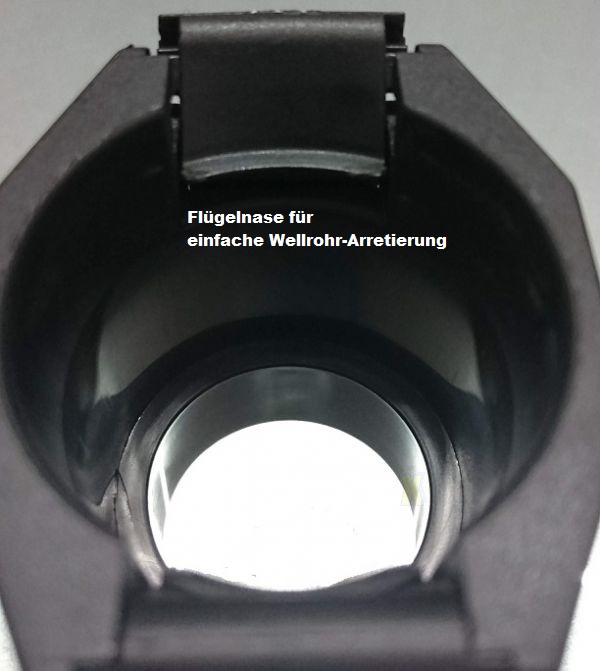 Um das Wellrohr wieder zu lösen, werden die Haltenasen in der Verschraubung einfach mit einem Schraubenzieher gelöst und können anschließend einfach wieder in die ursprüngliche Position gedrückt werden.