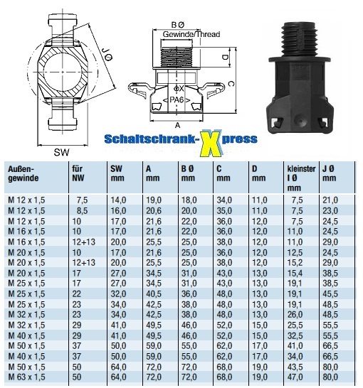 | Farbe(n)/Ausführungen: | • Schwarz, grau • Außengewinde: Metrisch/PG |